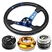 NRGSRK130HRG+200SL+101MB+016RBL, NRG Innovations 13.78" 350mm 3" Deep Dish Style Black Leather Blue Center Marking Blue Spokes Racing Steering Wheel Combo with 6 Hole Short Hub Adapter with Gen 2.0 Silver Quick Release with Matte Black Lock Hub Kit SRK-130H ![]()